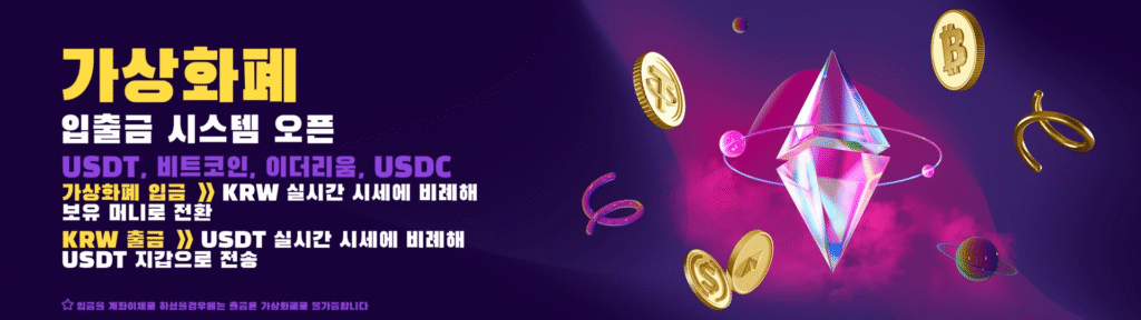 USDT, 비트코인, 이더리움, USDC 등 가상화폐를 통해 입금을 진행하면, 입금 시점의 실시간 시세를 기준으로 해당 금액이 원화(KRW) 기준 보유 머니로 자동 전환됩니다.