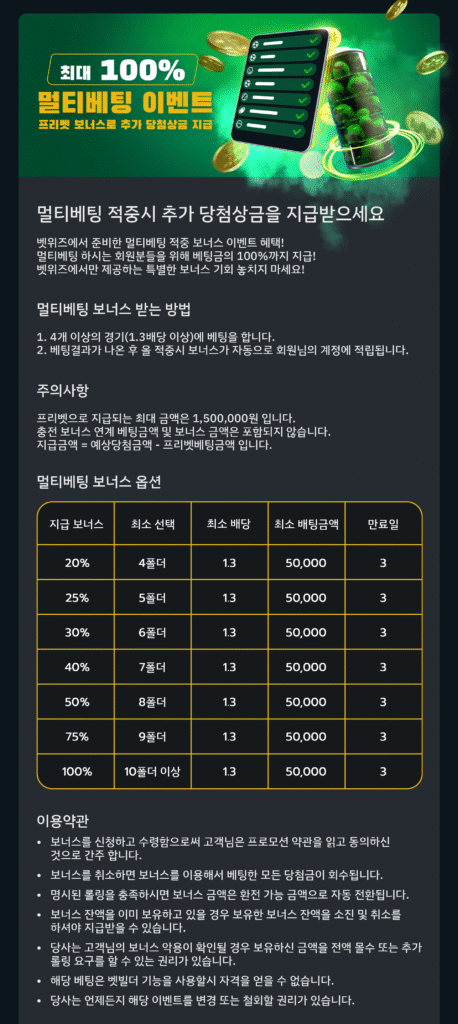 벳위즈에서는 멀티베팅 적중 시 추가 당첨금을 프리벳 보너스로 지급하는 이벤트를 운영하고 있습니다.