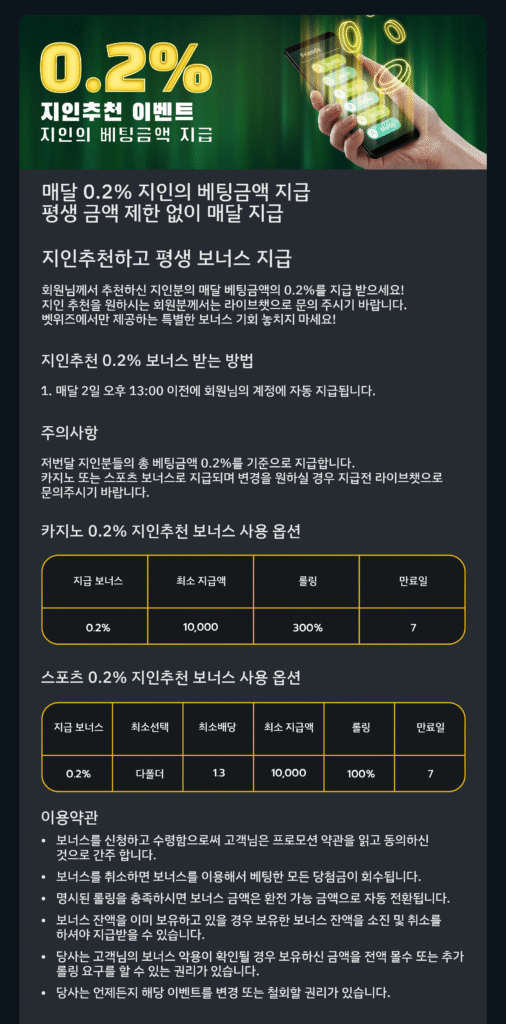 이 이벤트는 회원이 추천한 지인의 매달 베팅 금액을 기준으로 0.2%를 보너스로 지급하는 방식입니다.