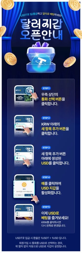 벳위즈에서는 USDT로 입출금하고 달러 기준으로 베팅을 원하는 이용자를 위한 달러 지갑 오픈 절차를 정리했습니다. 아래 순서에 따라 설정을 진행하면 USD 지갑을 활성화할 수 있습니다.