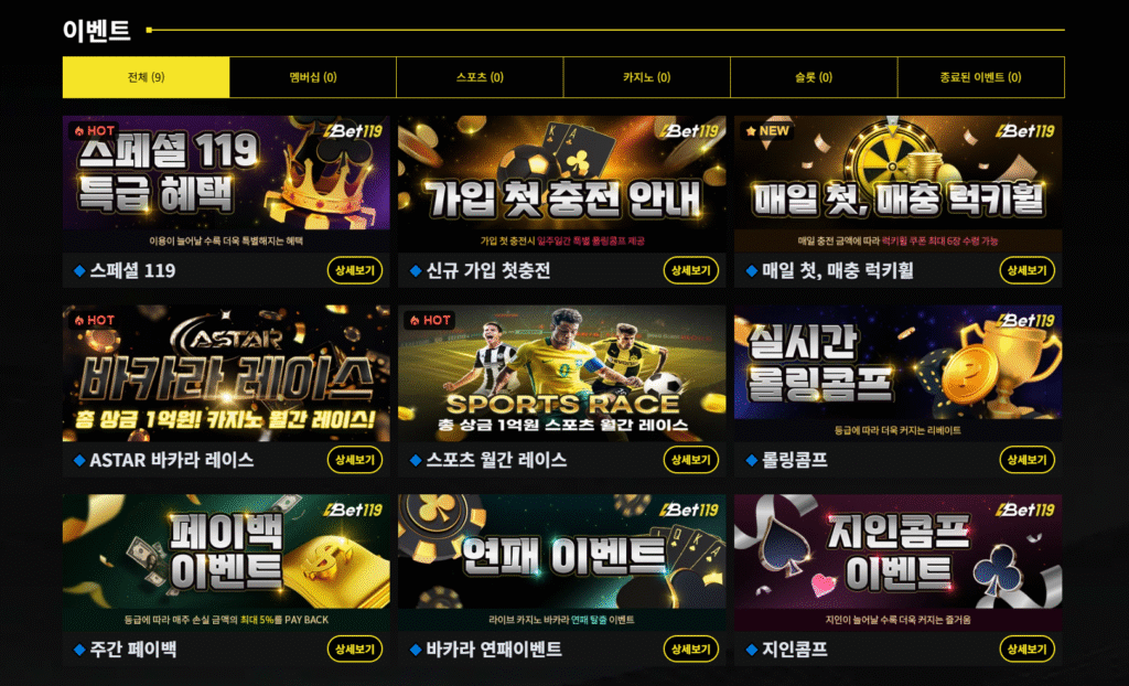 벳119 이벤트 메뉴를 기준으로 확인되는 이벤트를 살펴보면 몇 가지 유형으로 구분되는 구조를 확인할 수 있습니다.