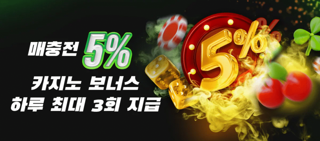 - 내 정보 > 보너스 페이지에서 ‘5% 카지노 매충전 보너스’ 신청