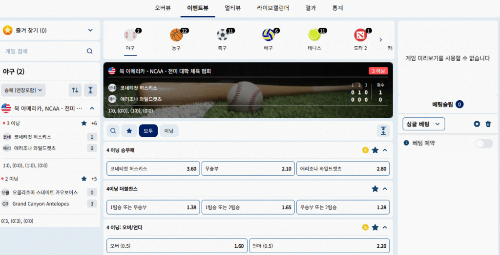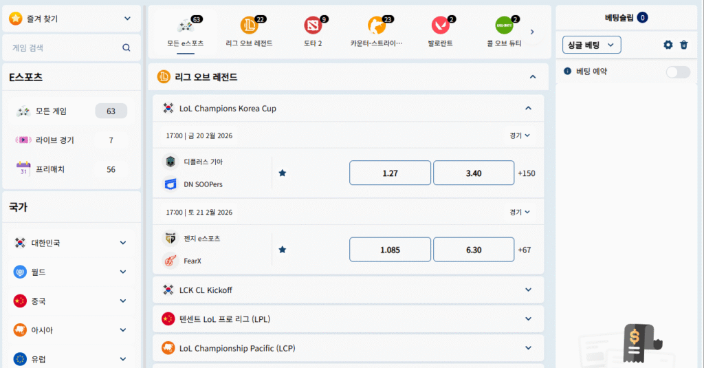 전통 스포츠와는 별도의 카테고리로 운영되지만, 인터페이스와 이용 흐름은 크게 다르지 않도록 설계되어 있어 기존 스포츠 이용자도 자연스럽게 접근할 수 있습니다.