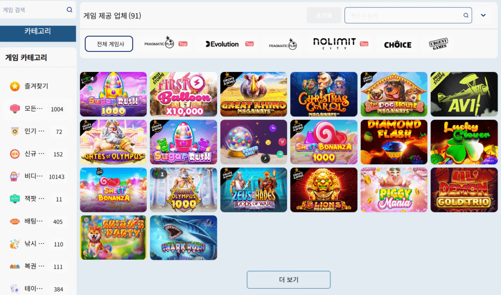제공사별 또는 카테고리별로 정리되어 있어 원하는 게임을 비교적 빠르게 찾을 수 있으며, 특정 테마나 스타일에 따라 선택이 가능합니다.